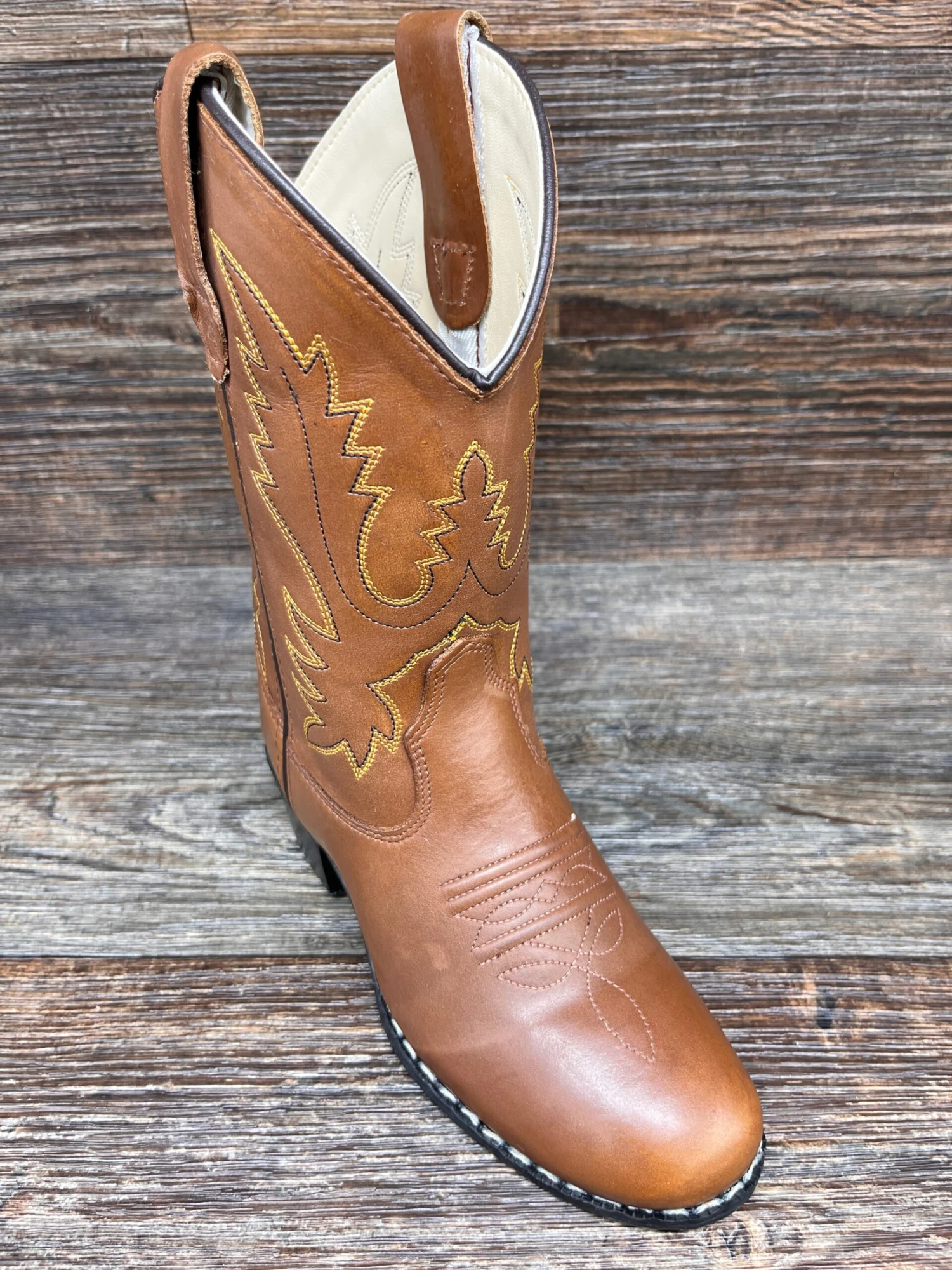 The 1129 Kid’s Round Toe Western Boot by Old West combines timeless style and superior craftsmanship for a classic cowboy look. Featuring all-leather foot and shaft, a 2-row fancy stitch, hand corded medallion, round toe, cowboy heel and PVC sole, these boots are sure to stand out.