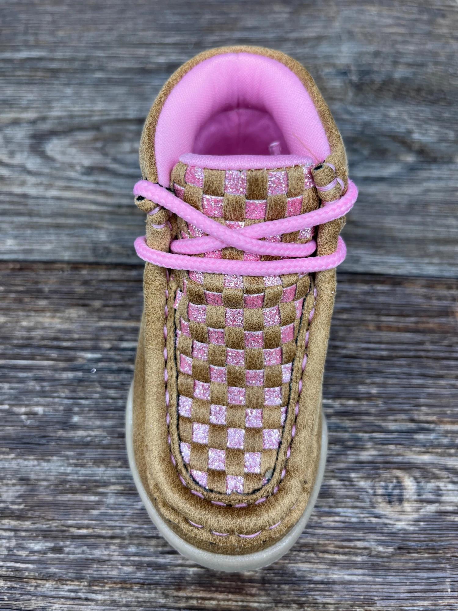 Tooled Faux Leather upper with Glittered Basketweave vamp