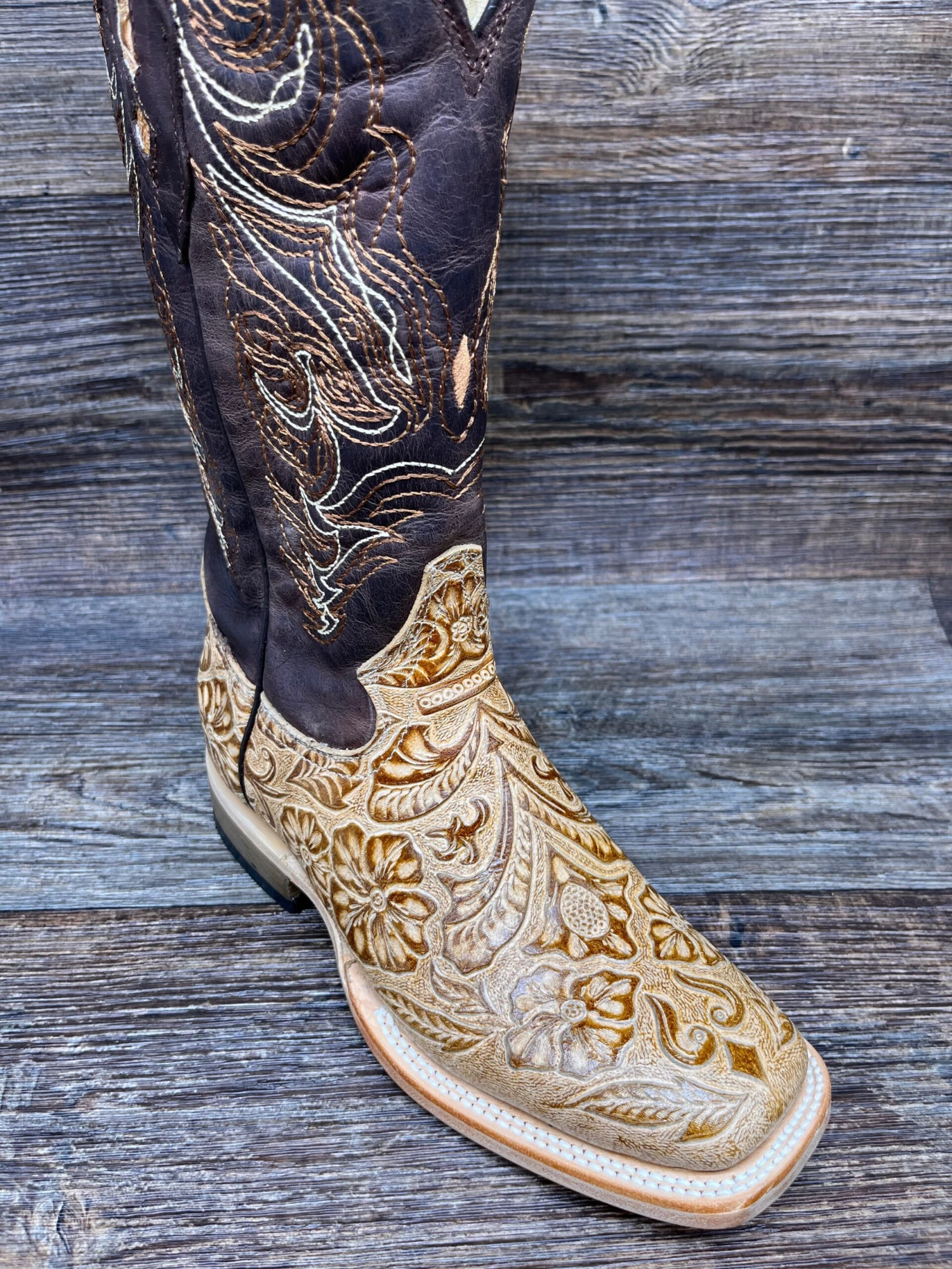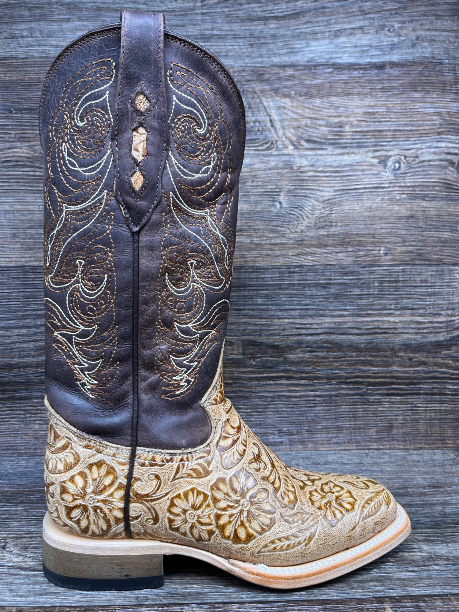 Tan Tooled Leather Vamp Vamp with 12 inch Western Stitched shaft
