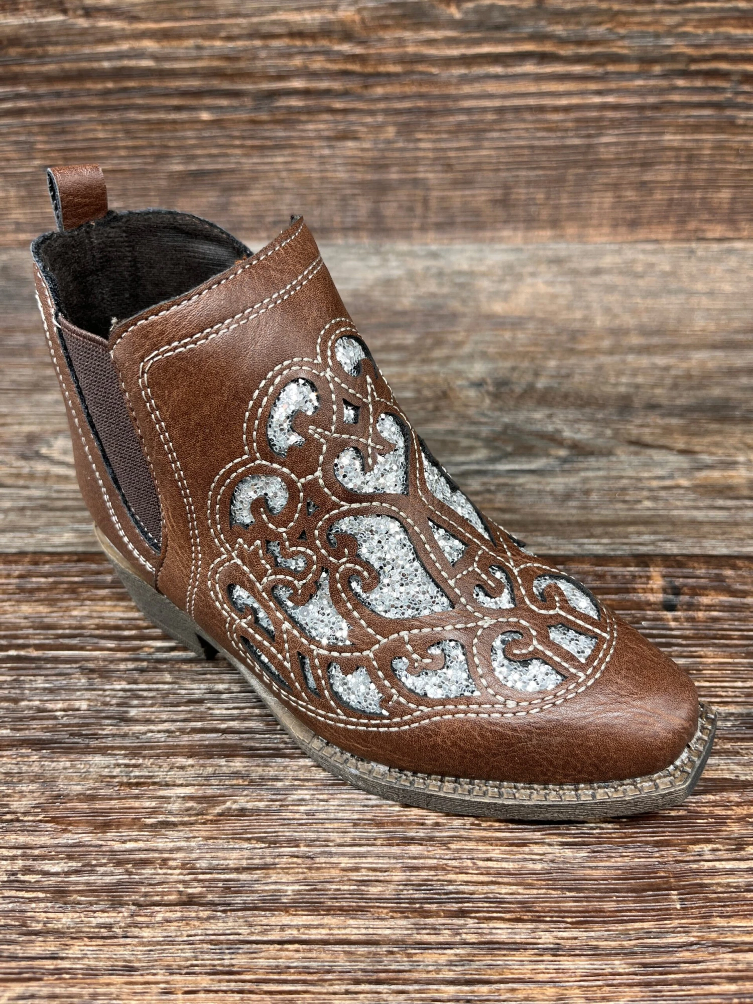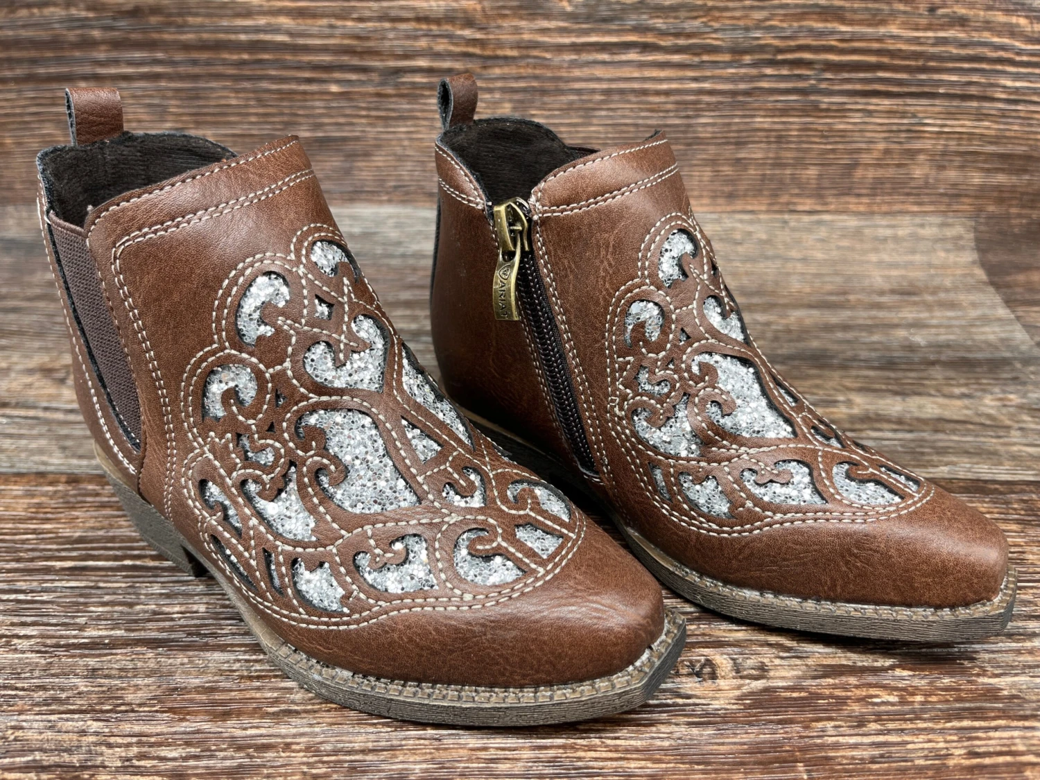 Step into adventure with these Kid’s Ariat Amy Dixon Ankle High Western Boots! Featuring a silver glittery inlay, a zip closure and an elastic panel, they offer a secure, stylish fit. Plus, their easy on/off pull tab makes them perfect for any wild ride!
