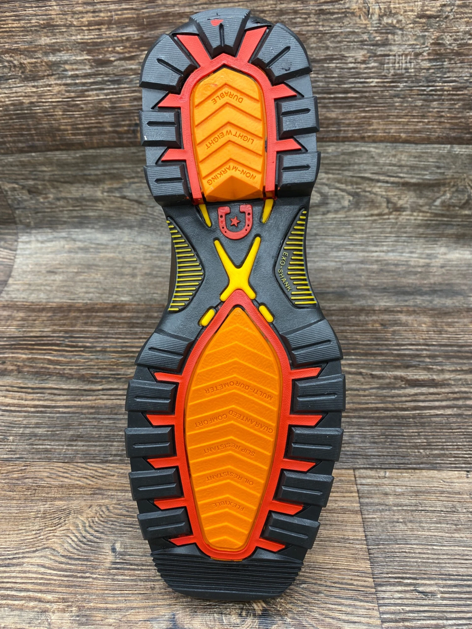 The midsole is dual-density with a firmer shock absorbing heel for added stability and a soft shock absorbing forepart for ultimate flexibility and comfort. The rolled shank area and anti-torsion rigid external shank provides added lateral stability and the outsole is multi-durometer rubber with high abrasion outer lugs for high impact durability and softer durometer mid lugs for added flexibility and increased slip and oil resistance. It has a single row sole stich around the square toe for added durability and a 1 ½” rocker heel.