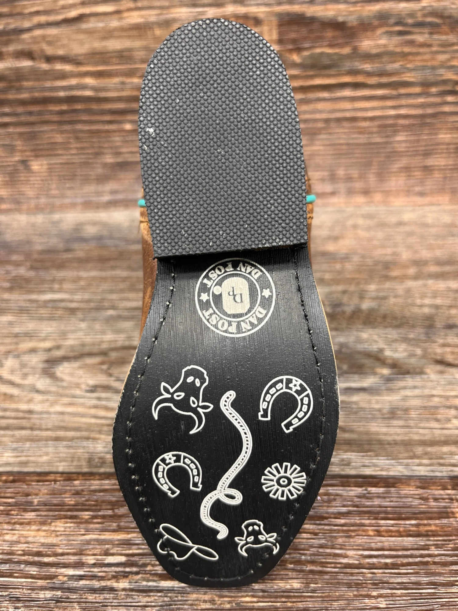 The upper design is inspired by modern artists for an explosion of color. Pops of color are random on the hair-on-hide leather. The blue trim brings the look together. Features cowboy square toe, cowboy heel, and rubber outsole. Made to be shown.