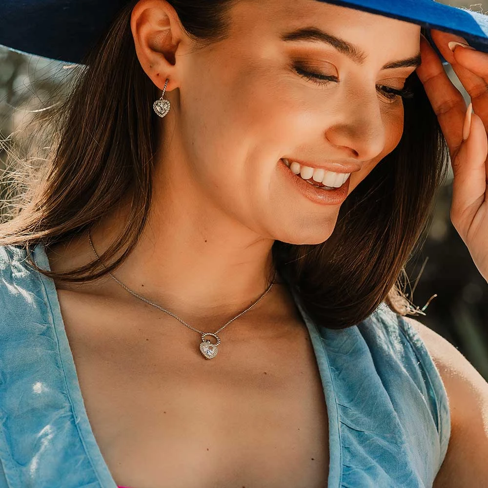 The center stone is a heart-shaped clear cubic zirconia stone surrounded by smaller clear cubic zirconia stones. The earrings hang from a textured hoop and are secured by a hypoallergenic clasp. The matching necklace dangles from a 19 inch split chain.