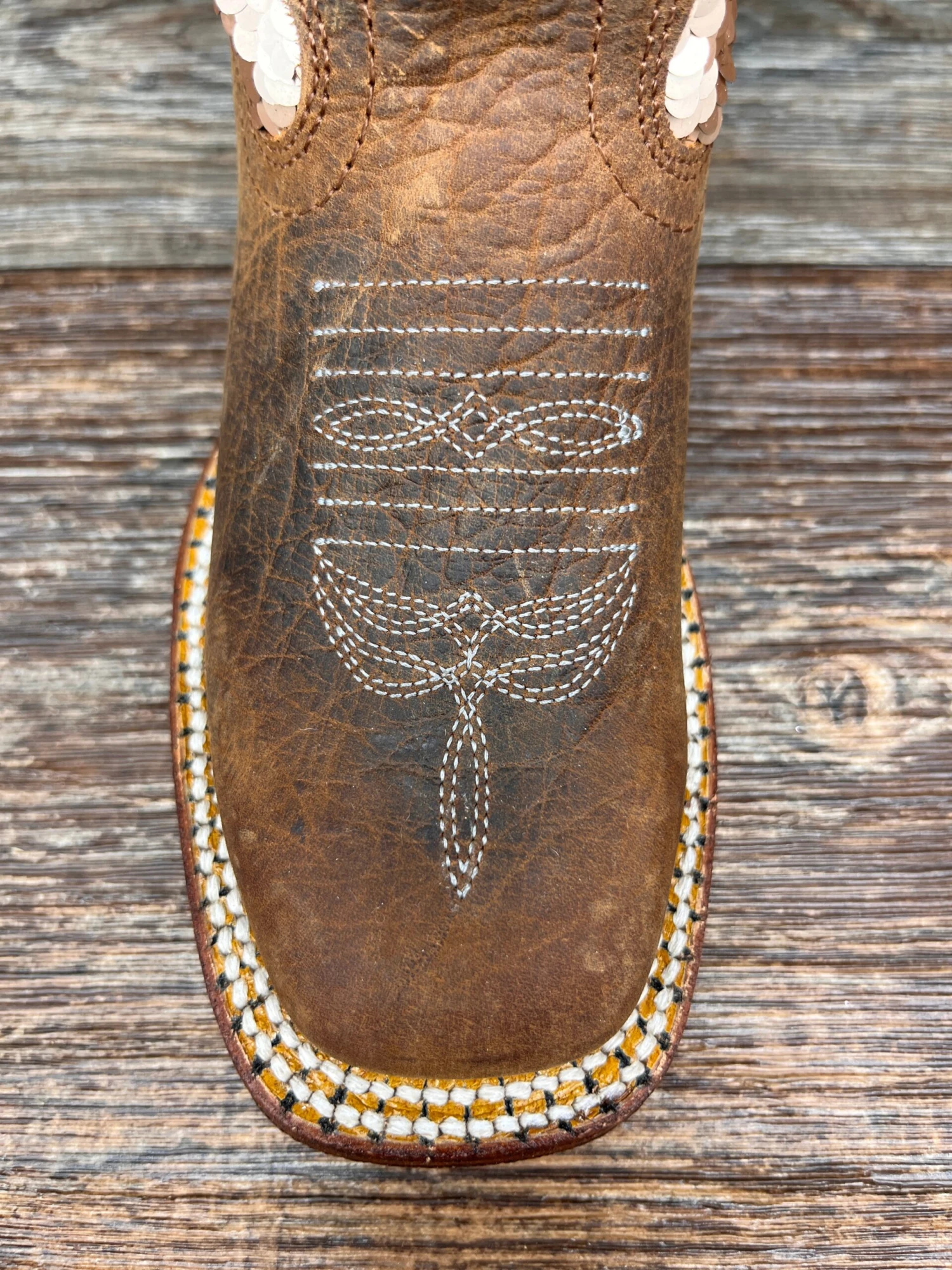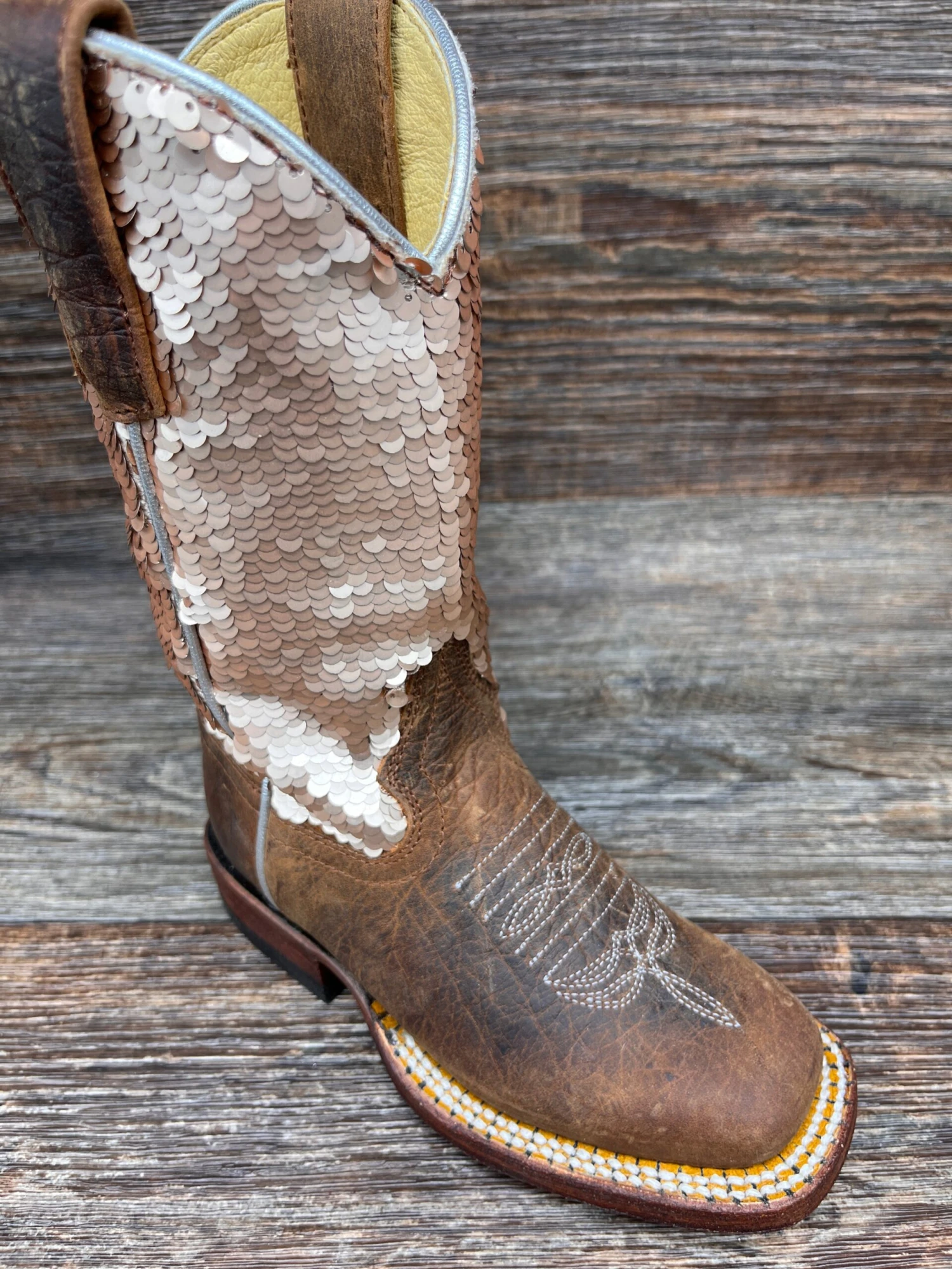 Looking for a unique boot your kids are sure to love? Look no further than this sparkle magic bison leather boot by Macie Bean. With a genuine distressed bison vamp, leather dress sole, and 3/4 goodyear welt, nobody can say these aren’t 100% genuine western, but the real draw is a shaft bedazzled with double sided reversible sequins designed to catch the light from any angle! You have to see it to believe it! Back that up with Macie Bean’s proven boot making pedigree and you’ve got a winner they’ll enjoy for as long as their little feet still fit them!