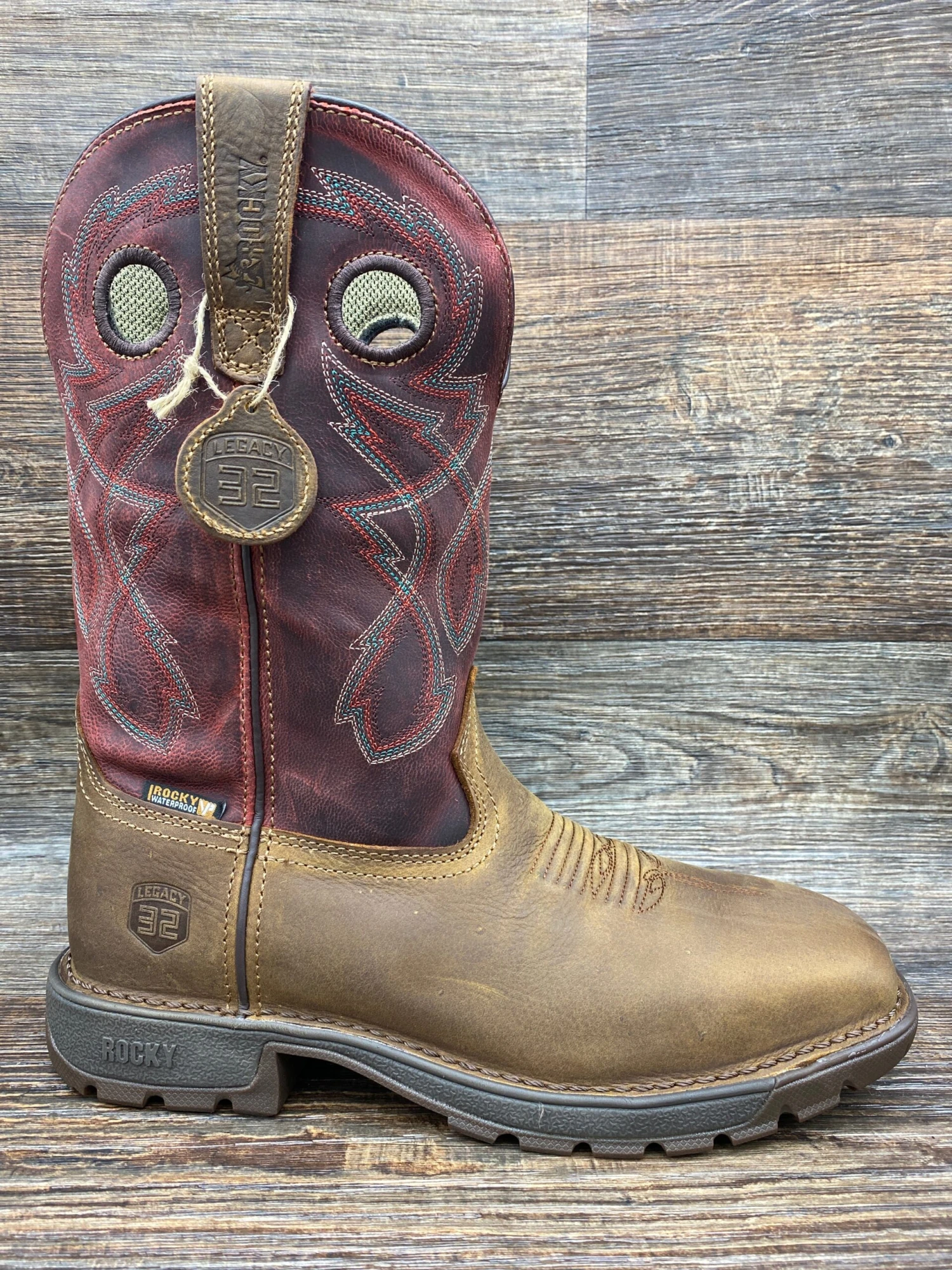 The Rocky Legacy 32 takes a classic work western silhouette and adds the latest in comfort and technology. These 10-inch tan and red work wellingtons are designed to offer all day comfort, safety, and stability. With a stitch out construction, an oil and slip resisting Proprietary Vibram® rubber outsole with a cushioned EVA midsole, and a fiberglass shank, these boots are built to last. Take on any terrain with waterproof full grain SPR leather and Rocky’s VP Waterproof technology that keeps your feet dry without trapping perspiration in. We’ve added a steel toe to this square toe silhouette to ensure even more safety. Getting into these boots is easier than ever with Rocky’s Expansion Fit Seam that stretches when putting the boot on and then returns to its original shape. If you’re looking for a work wellington boot that looks as good as it feels and offers safety where you need it the most, get the Rocky Legacy 32.